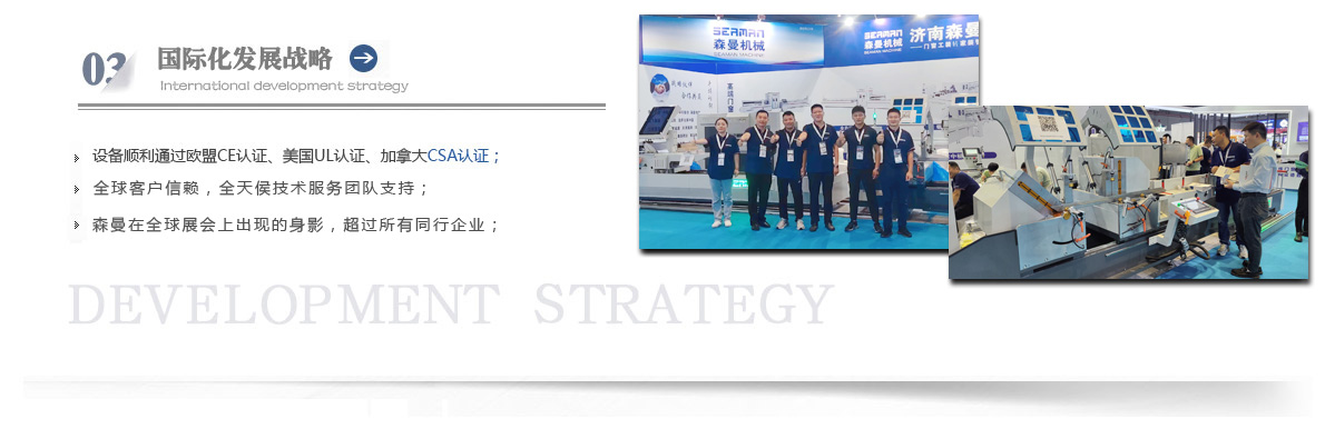“森曼機械”作為全球門窗設(shè)備供應(yīng)商,本著"seaman"精神,勇立潮頭,拼搏創(chuàng)新,以爭做行業(yè)為目標(biāo),在行業(yè)前輩發(fā)展的基礎(chǔ)上,努力學(xué)習(xí),積極進取。目前公司產(chǎn)品涵蓋塑料門窗設(shè)備、鋁合金門窗設(shè)備、鋁幕墻設(shè)備、鋁木復(fù)合門窗設(shè)備及中空玻璃設(shè)備五大種類,近百個品種。公司產(chǎn)品銷售至全國各地及東南亞、非洲、東歐、北美等幾十個國家和地區(qū)。在這個競爭激烈的年代,我們正努力使我們的產(chǎn)品!